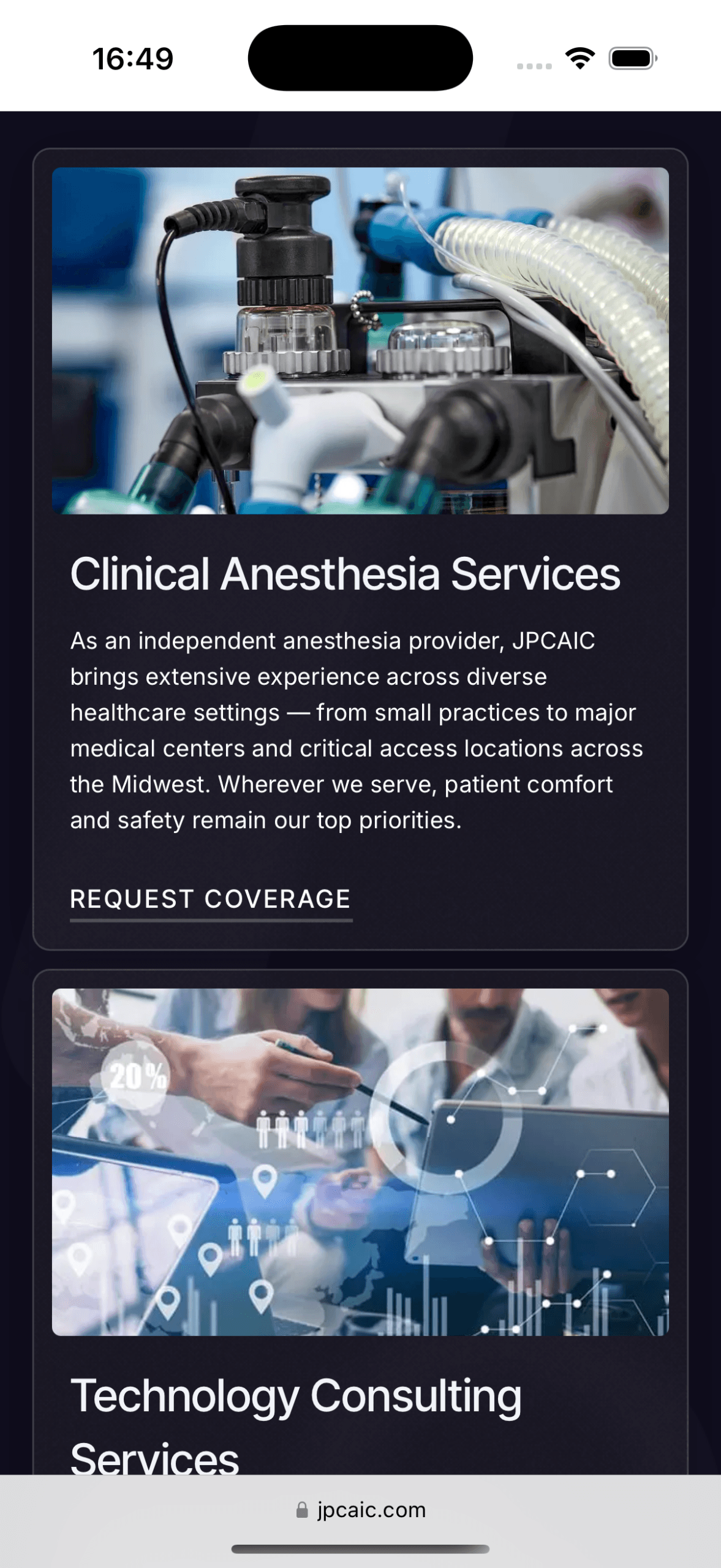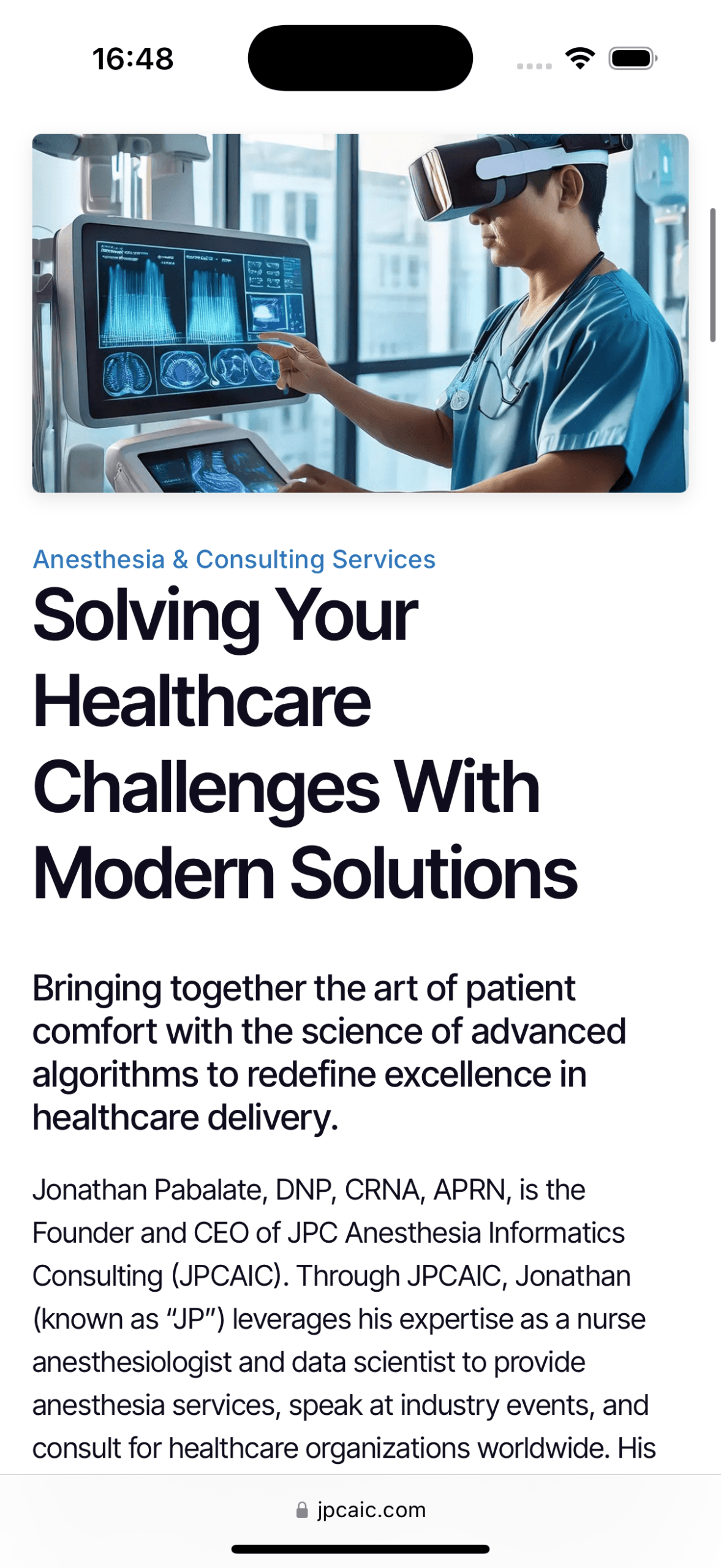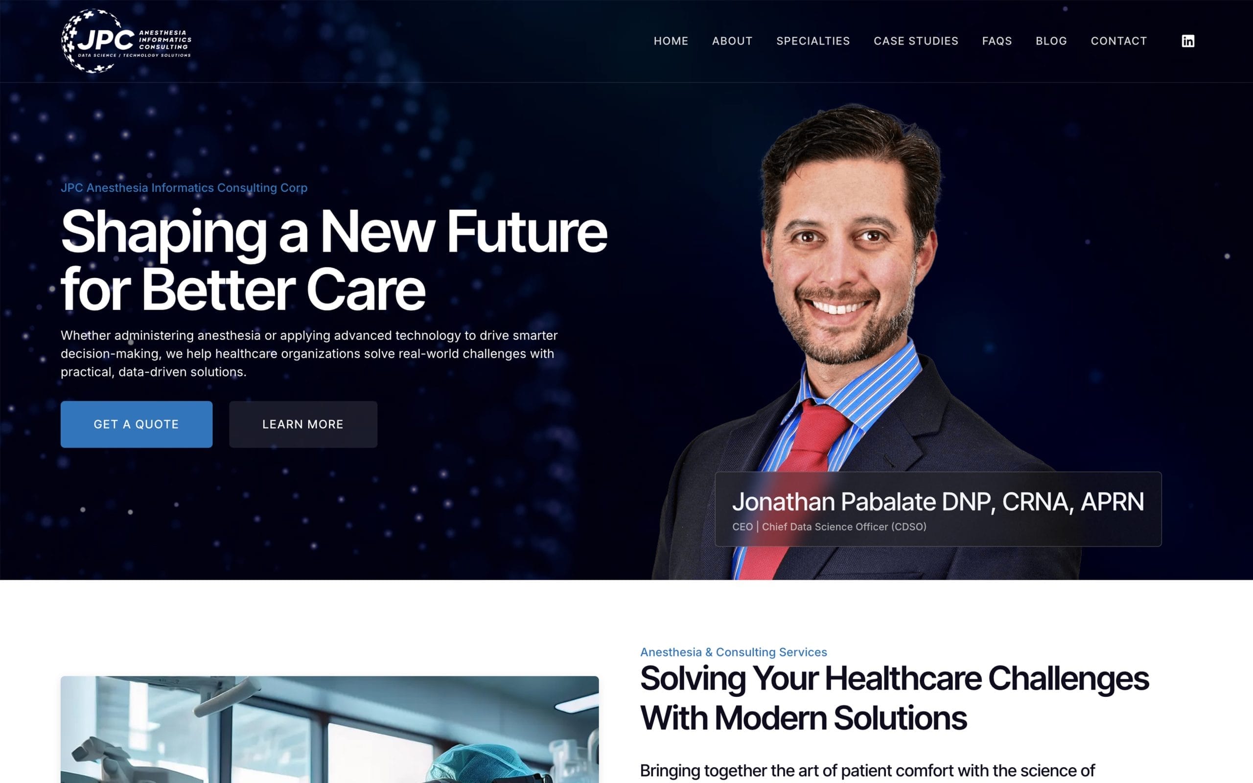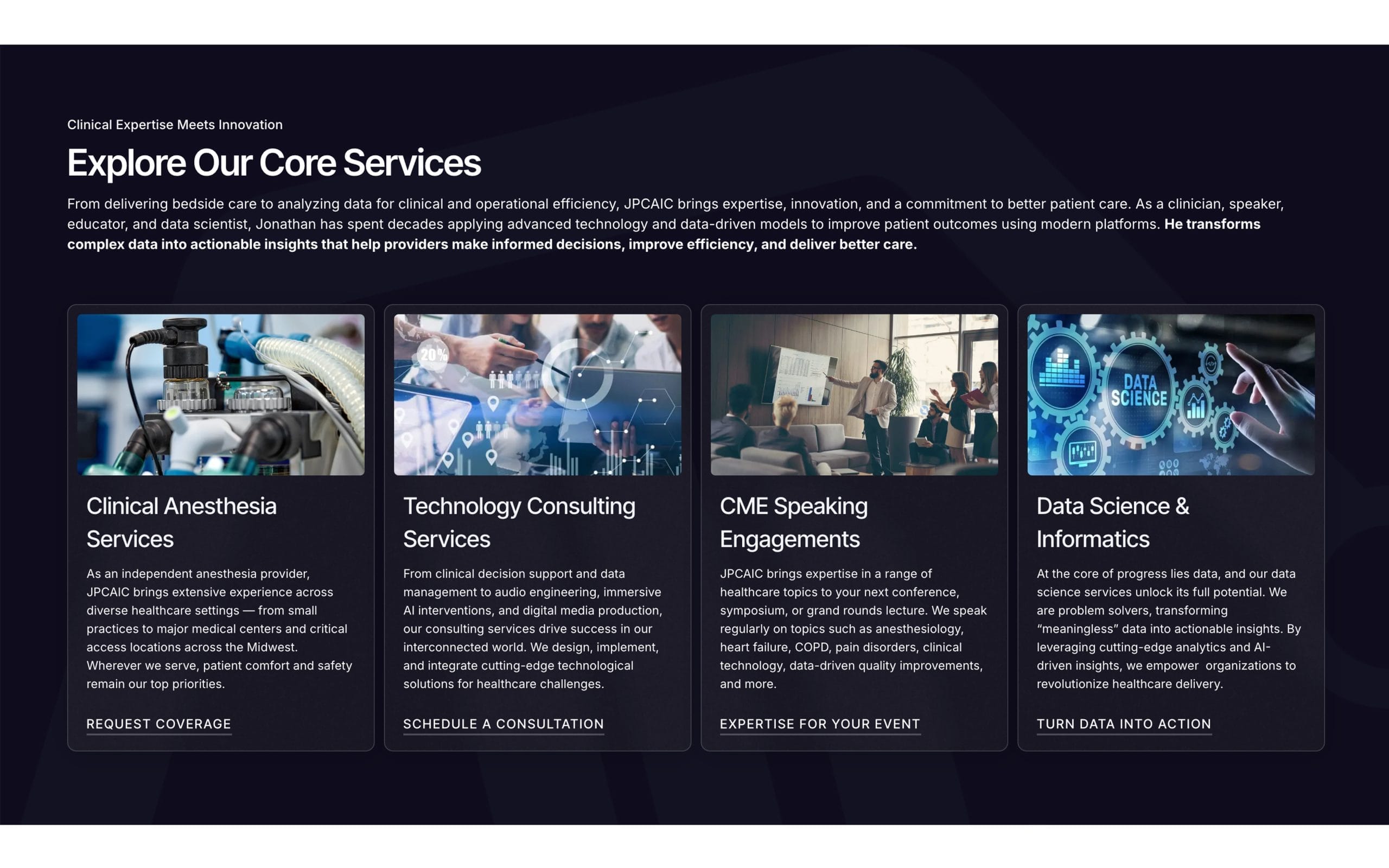 Oferta JPCAIC acoperă atât servicii clinice de anestezie, cât și consultanță în tehnologie și știința datelor, ceea ce făcea dificilă clarificarea rapidă a beneficiilor pentru tipuri diferite de decidenți din healthcare. Site-ul vechi nu ghida utilizatorii către acțiuni clare (programări, cereri de acoperire, consultanță) și nu valorifica suficient autoritatea fondatorului. Era nevoie de o arhitectură de informație mai clară, mesaje diferențiate pe servicii și trasee de conversie scurte.