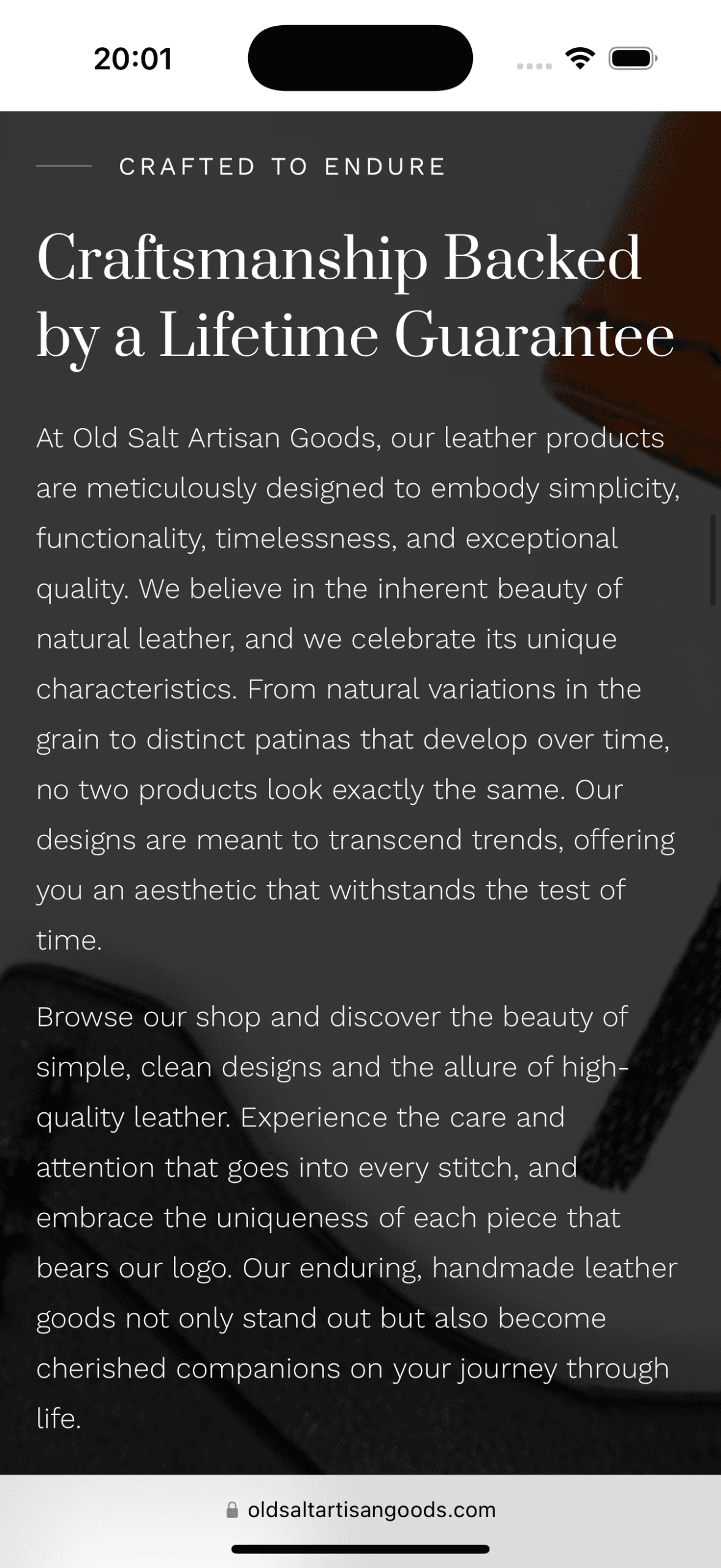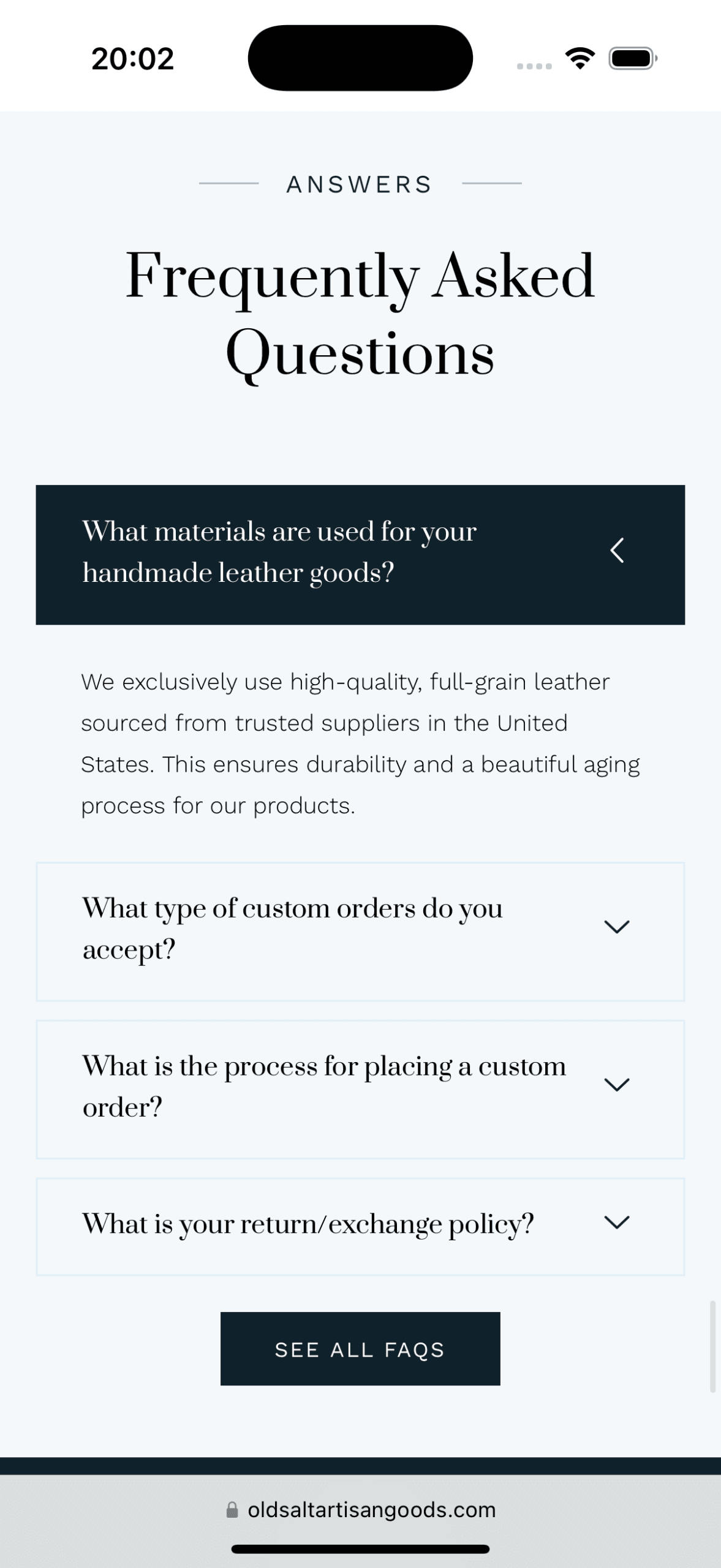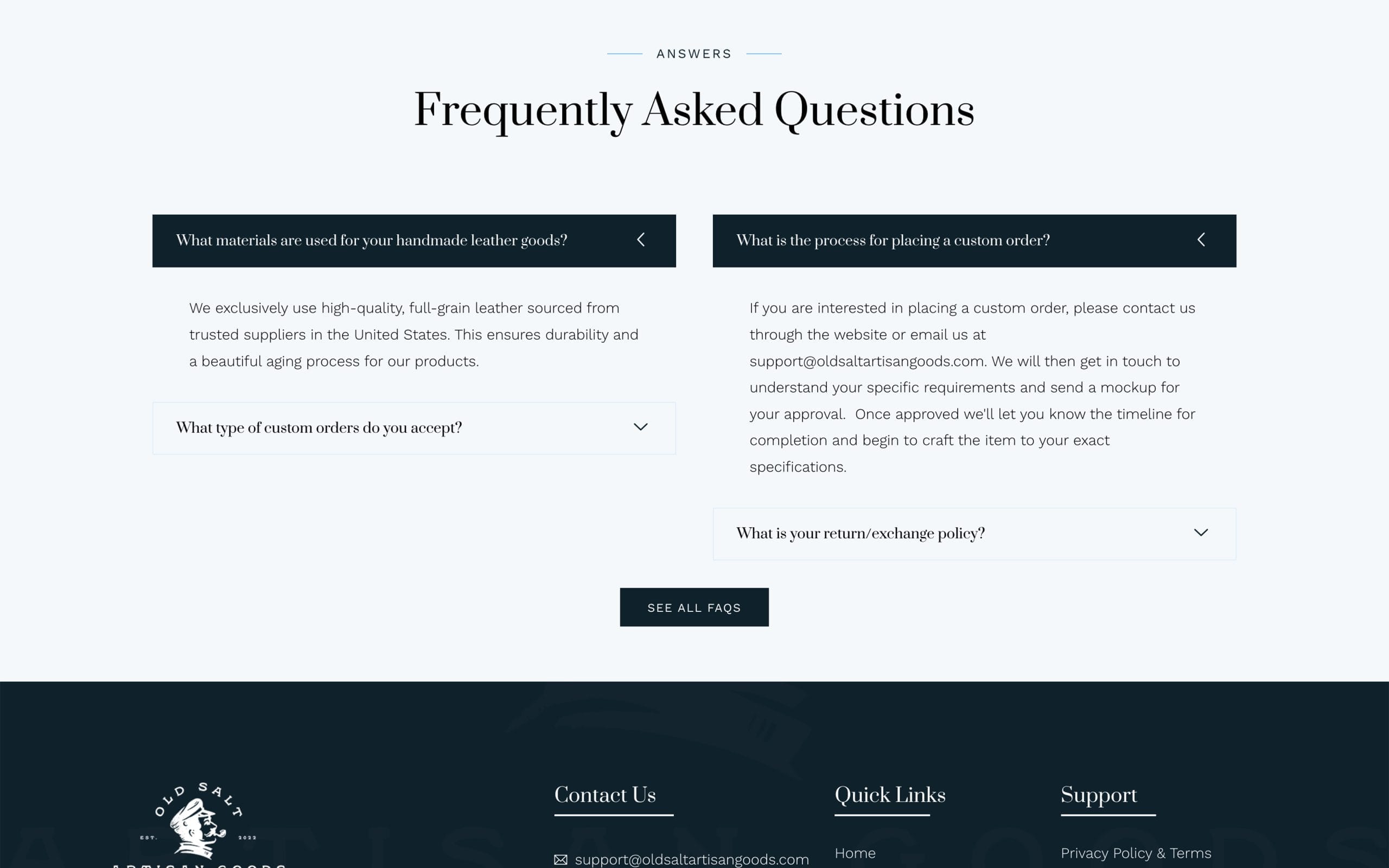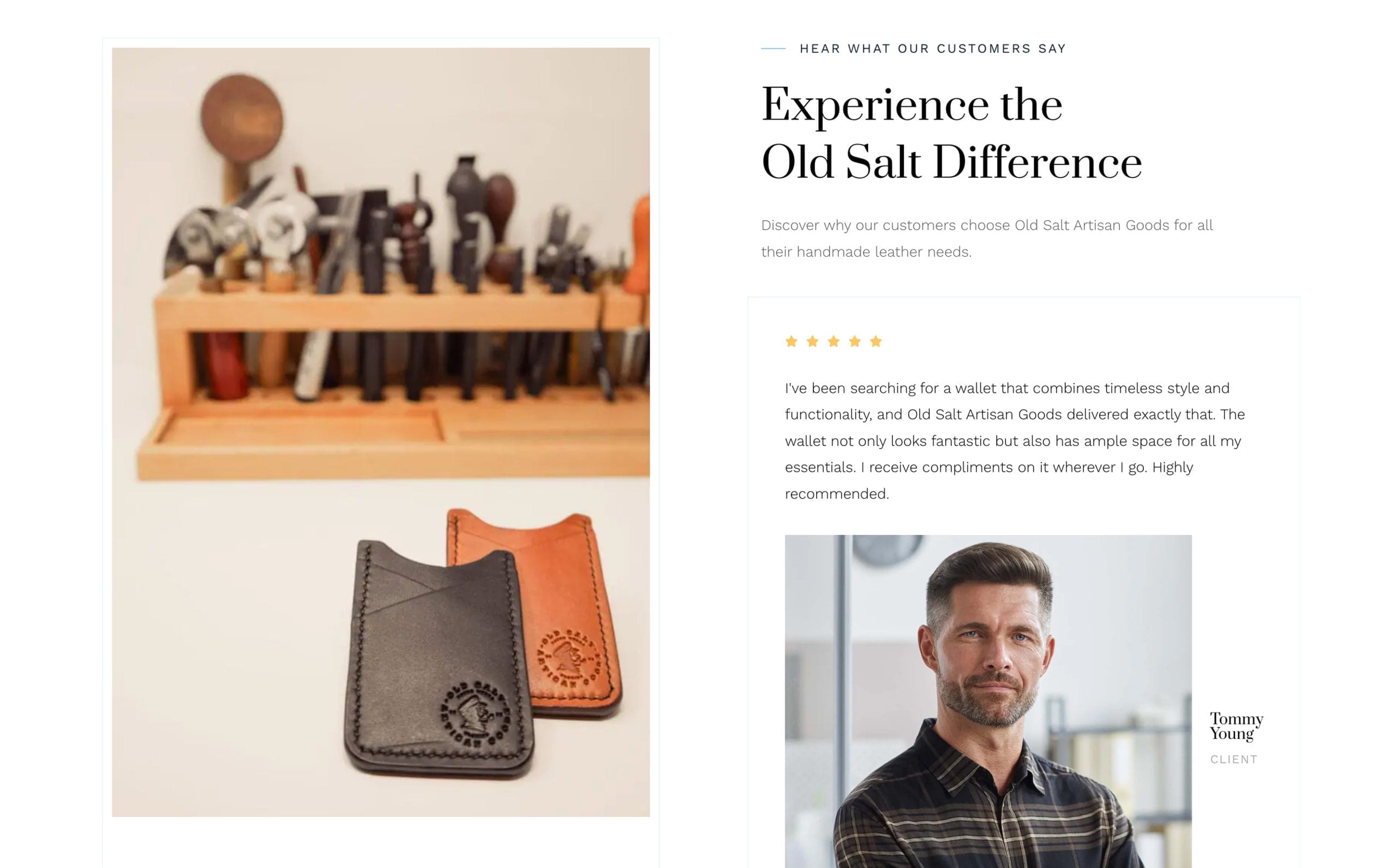 Utilizatorii găsesc rapid produsele, înțeleg diferențiatorii (full-grain, patină, garanție) și pot cere comenzi custom. FAQs clarifică întrebările frecvente, iar CTA-urile din Home și Shop scurtează drumul până la checkout, crescând șansele de conversie.
