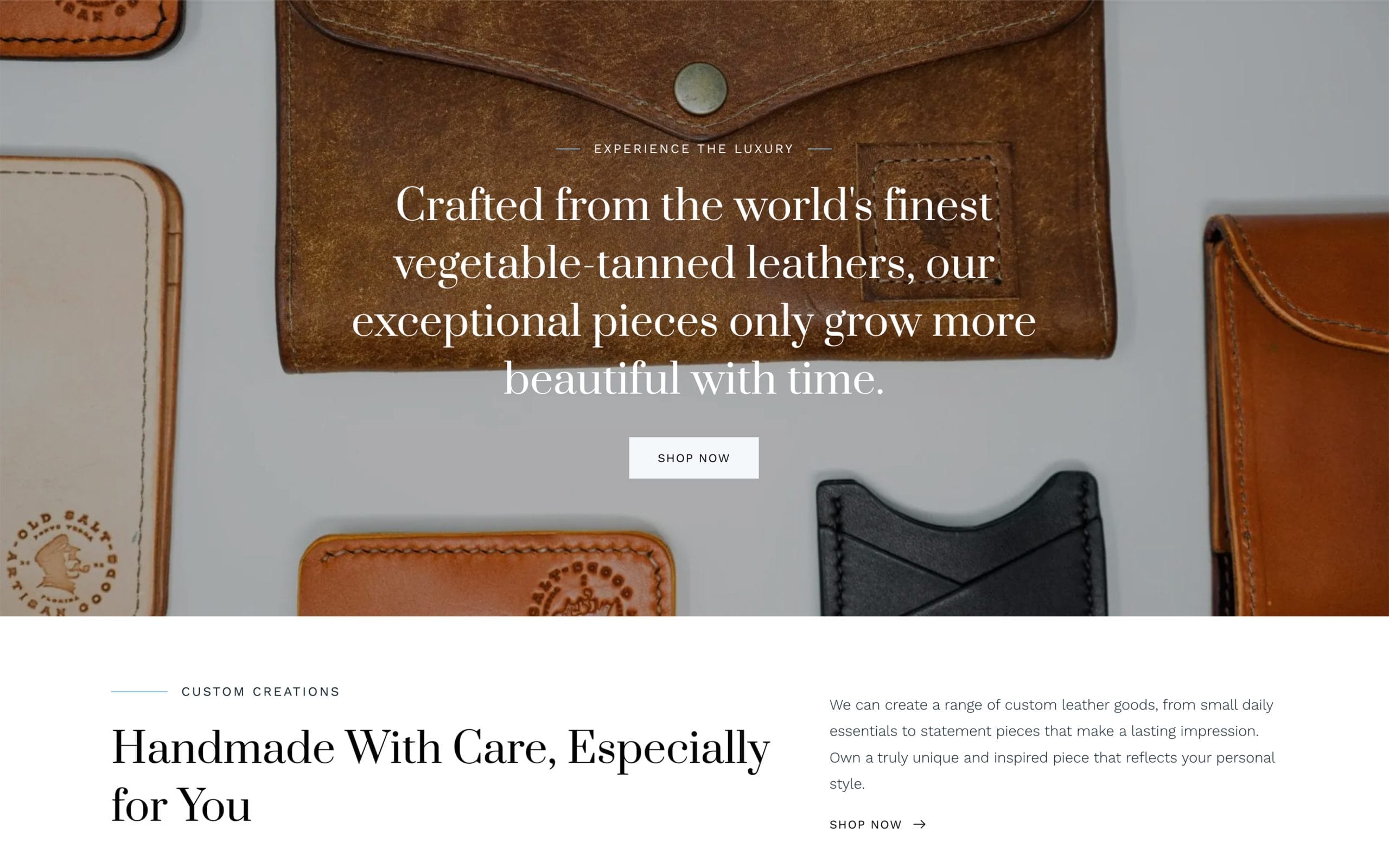 Am structurat magazinul pe pagini esențiale: Home cu USP-uri „Crafted with Tradition”, grid de produse și CTA „Shop now”, Shop cu prețuri vizibile, About pentru poveste și valori, FAQs cu materiale, retururi și procesul de comenzi personalizate, Contact pentru suport. Am evidențiat garanția pe viață și calitatea pieilor vegetale, plus testimoniale pentru încredere.
